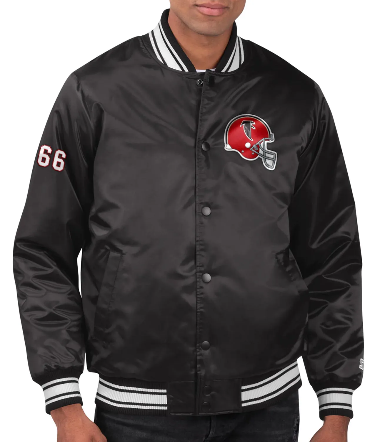 The Throwback Helmet Atlanta Falcons Black Jacket is for all those who like to wear a classy outfit with a modern touch. Its premium quality satin fabric makes it light in weight and wearable in all seasons and the soft viscose inner makes it comfortable as long as you wear it. The strong black color will enhance your smartness. The Starter Replica Atlanta Falcons Throwback Helmet Black Satin Jacket has been fashionably tailored by using features like a rib-knitted stand-up collar, snap tab buttoned closure, rib-knitted cuffs, and hemline and side waist pockets. The Starter Replica Atlanta Falcons Throwback Helmet Black Satin Jacket will allow you to wear it casually while doing your day-to-day task.