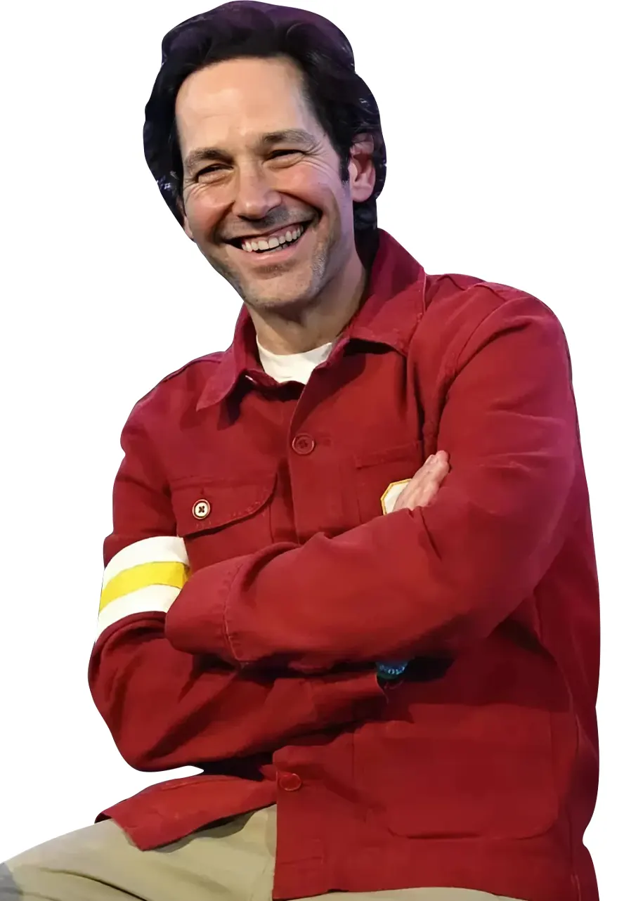 Show off your style with this iconic red denim jacket, worn by paul rudd at the big slick celebrity weekend. crafted from durable denim with a soft viscose lining for comfort, this jacket features a classic shirt-style collar, button closure, and buttoned cuffs. it also offers ample storage with four outer pockets and two inner pockets. a standout piece for any chiefs fan or fashion enthusiast!
