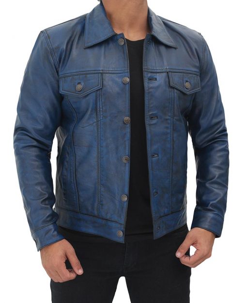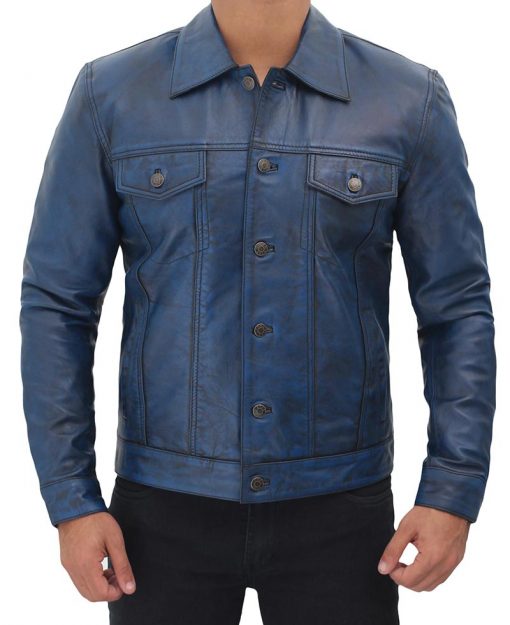 No one can stop watching you when you are around while wearing the Mens Blue Trucker Jacket, it will not only leave you with an eye-catching personality but also keep you comfortable. Its premium quality real leather makes it warm and luxuriant and its soft viscose inner will comfy you for how long you wear it. Its distressed blue color will look fantastic on you. The Men’s Blue Genuine Leather Trucker Jacket has featured shirt style collar, buttoned closure, chest flapped and side waist pockets, and buttoned cuffs. The Men’s Blue Genuine Leather Trucker Jacket is an outfit that can be worn everywhere on any occasion.
