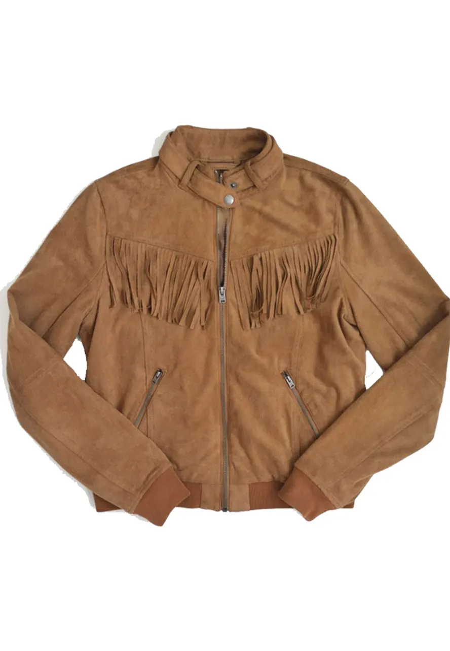 Made from suede leather, the Good Girls Mae Whitman Frostman Jacket is for you. This jacket comes in a classic brown color, which gives it an elegant and sophisticated look. It features a snap button collar and a zipper closure that is branded. The jacket’s inner consists of soft viscose lining, which provides warmth as well as comfort. The jacket’s sleeves are long and fitted with rib knitted sleeves. It has fringes at the chest that make it even more attractive. The Good Girls Mae Whitman Fringe Jacket features two zipper pockets at the waist. This jacket is durable thanks to its fine quality stitching. This jacket is ideal for a night out.