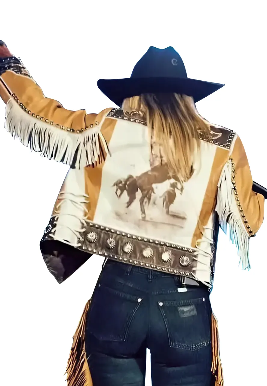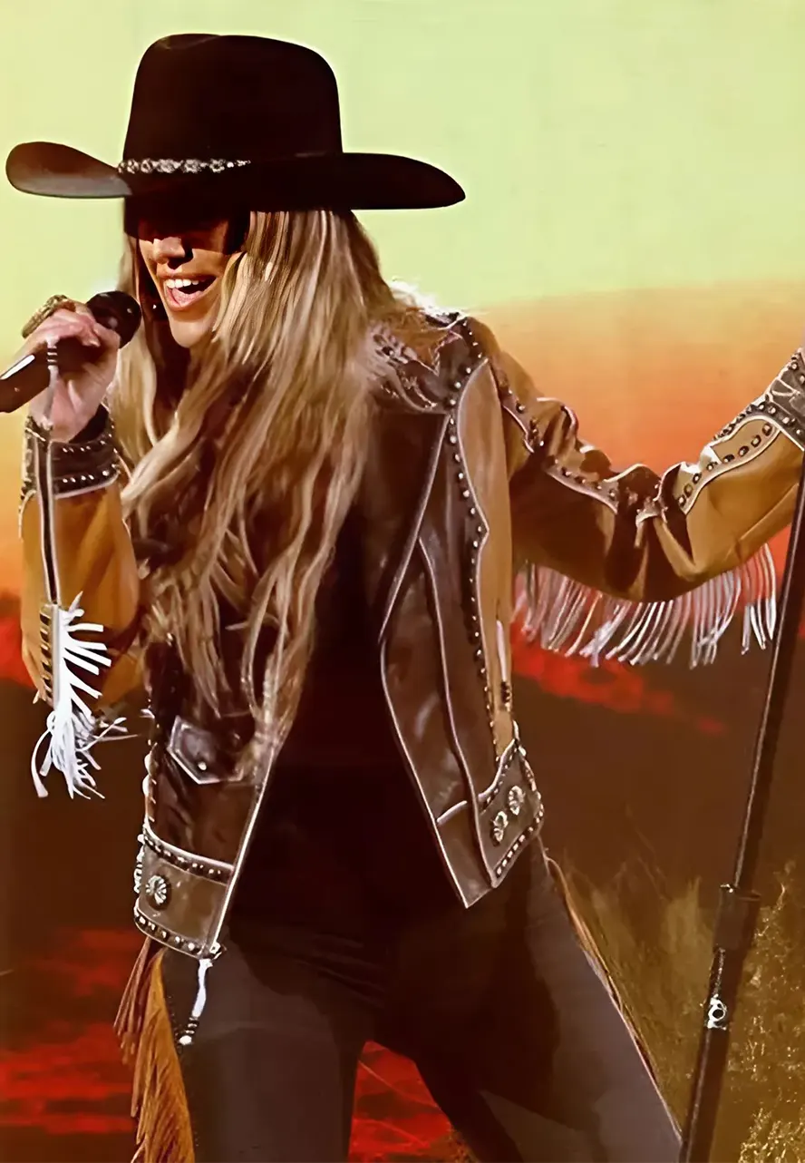 American Singer Lainey Wilson Peoples Choice Awards Brown Fringe Leather Jacket