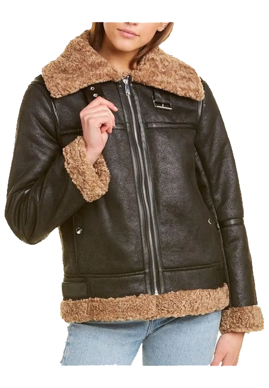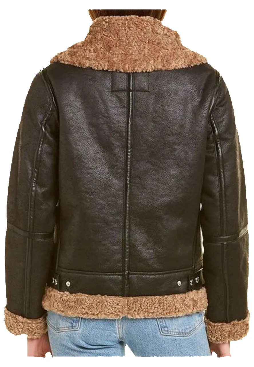 Laura Black SF Bomber Aviator Pilot Flight Sheepskin Brown Shearling Fur Jacket