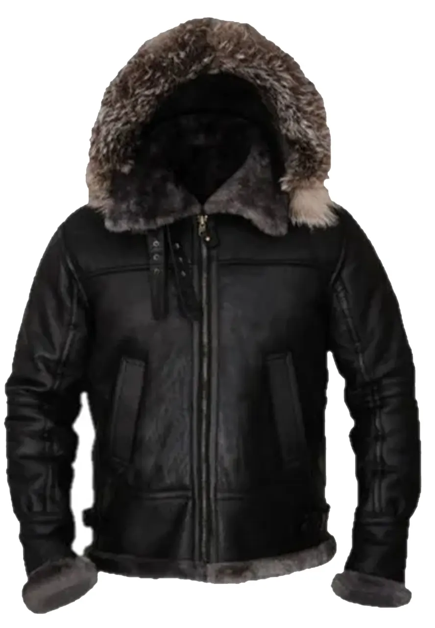 Mens Robert All Black Shearling Fur B3 Bomber Parka Leather Jacket With Hood