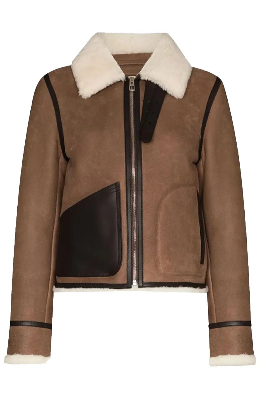 Sara Shearling Spread Fur Collar Aviator Brown Leather Jacket