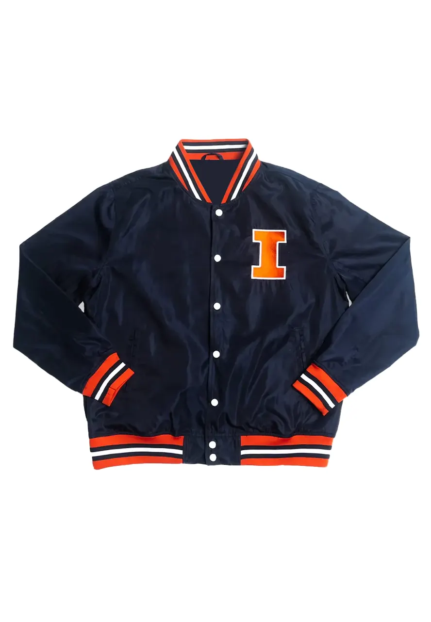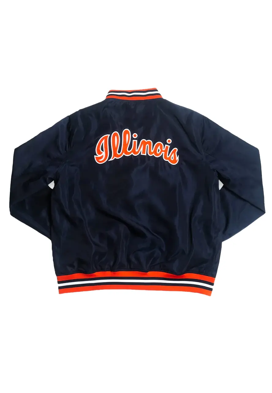 Vintage Navy Blue Script Illinois Fighting Bomber Full-Snap Satin Jacket