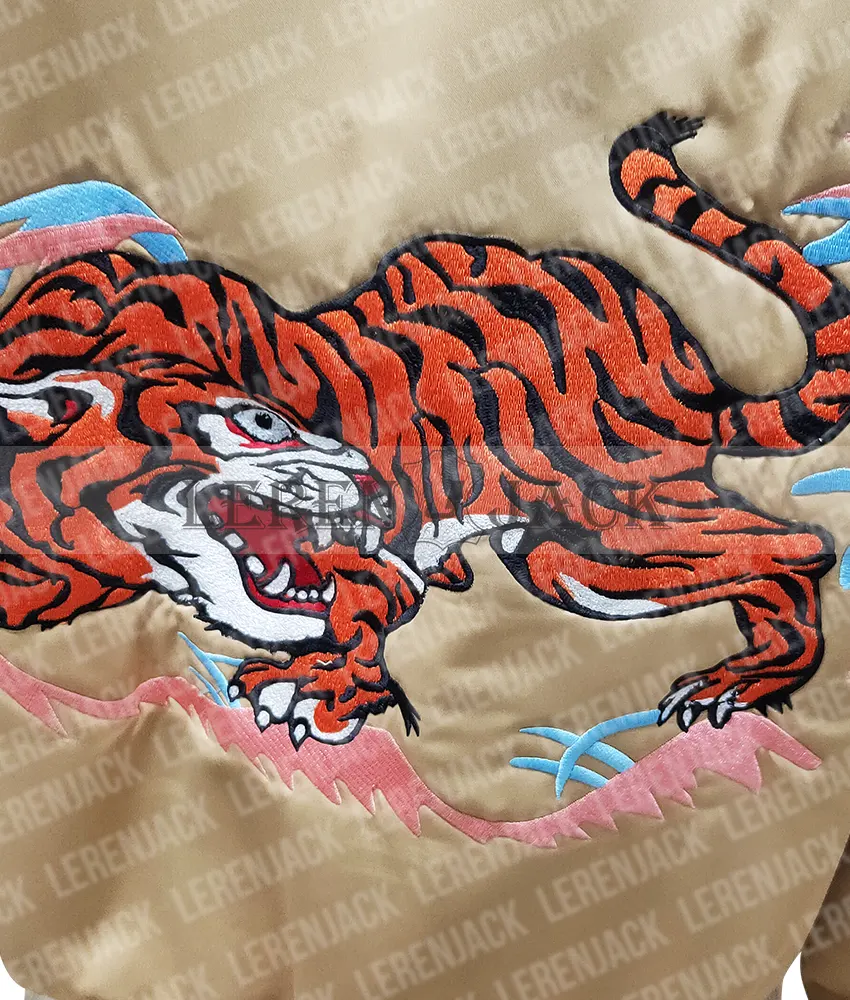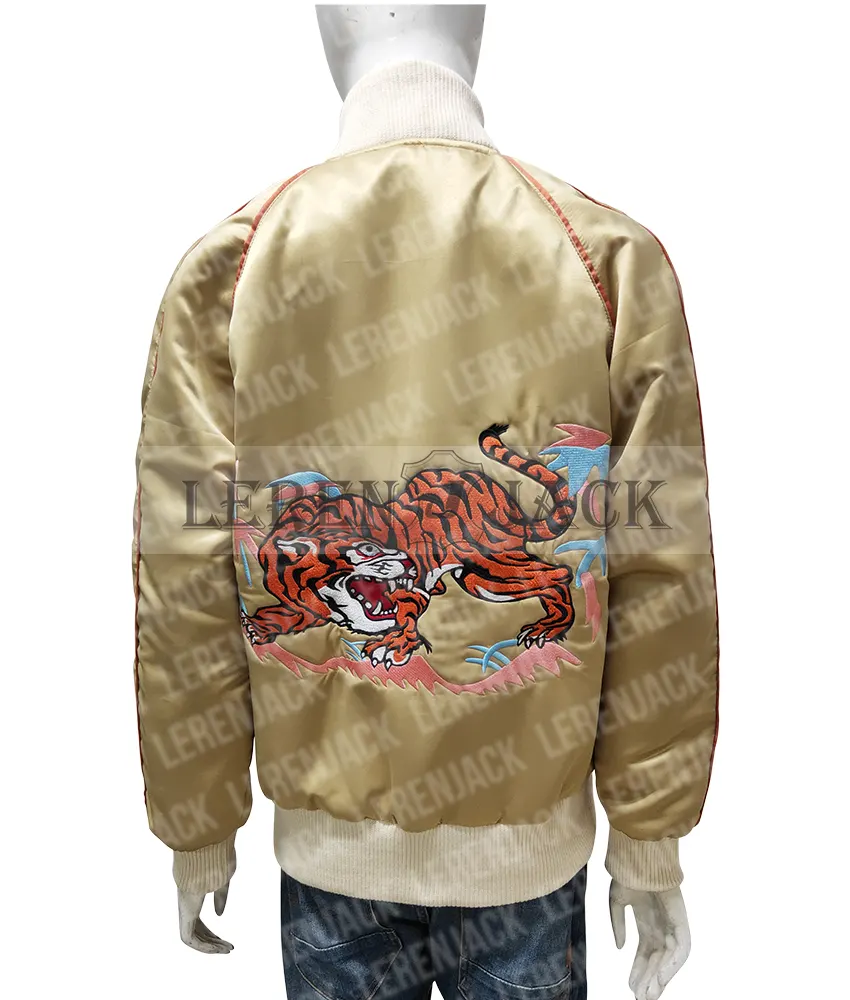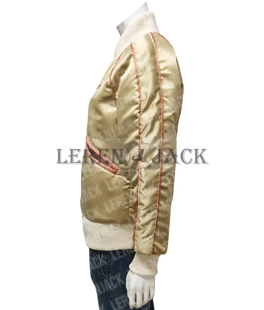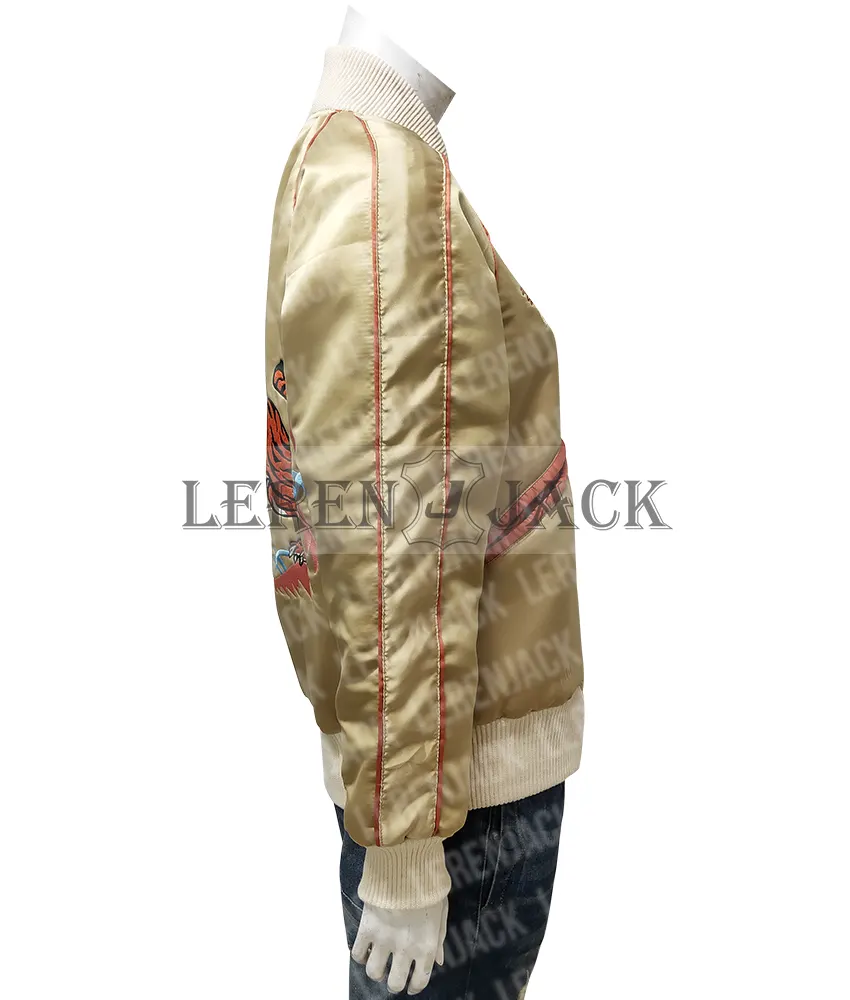 If you want to wear a style that capture the attention of all and everyone around you wants to follow it, then you must shop and wear the Cradle of Life Lara Croft Angelina Jolie Jacket. Its top-quality satin fabric makes it light in weight and wearable at special occasions and its soft viscose inner will comfy you for how long you wear it. The golden color makes it too charming to wear. The Angelina Jolie Cradle of Life Lara Croft Satin Bomber Jacket with Tiger Patch has all smart features like rib-knitted round collar, smooth zippered closure, rib-knitted cuffs and hemline and side waist pockets. The Angelina Jolie Cradle of Life Lara Croft Satin Bomber Jacket with Tiger Patch will make you cynosure of all eyes.